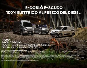 DETTAGLIO PROMOZIONE: Es. di leasing finanziario Evolease su DOBLO’ VAN M Elettrico 100kW: Prezzo di Listino 31.600 € (Messa su strada, IPT e contributo PFU esclusi), Prezzo Promo 18.600 €. Valore fornitura 18.600 €: Primo canone anticipato 5.970 €, durata 60 mesi; 59 canoni mensili da 159 € (incluse spese di gestione di 11,86 € /canone ed il servizio Identicar 12 mesi per un importo mensile del servizio 3,7 € /canone, Messa su strada e contributo PFU esclusi). Valore di riscatto 7.299,6 €. Importo Totale del Credito 13.181,26 € Spese Istruttoria 0€. Bollo 16 €. Spese invio rendiconto periodico cartaceo: 0 €/anno. Interessi Totali 2.580,71€. Importo Totale Dovuto 21.180,71€ (escluso anticipo e comprensivo dell’eventuale Valore di Riscatto). Solo in caso di restituzione e/o sostituzione del veicolo alla scadenza contrattualmente prevista, verrà addebitato un costo pari a 0,05 €/km ove il veicolo abbia superato il chilometraggio massimo di 100.000 km. TAN (fisso) 4,99%, TAEG 7,03%. Tutti gli importi sono indicati al netto di IVA (ove prevista). Offerta riservata ai titolari di Partita IVA per contratti stipulati entro il 30 giugno 2026, non cumulabile con altre iniziative in corso. Offerta Stellantis Financial Services Italia S.p.A. soggetta ad approvazione. Documentazione precontrattuale bancaria/assicurativa in concessionaria e sul sito www.stellantis-financial-services.it (Sez. Trasparenza). Messaggio Pubblicitario con finalità promozionale